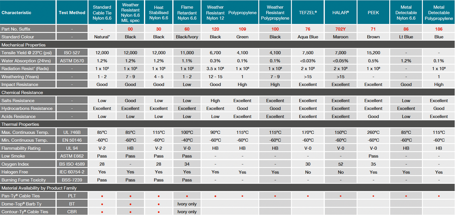 A wide range of cable tie products are available in a selection of materials (see above chart), used extensively across a broad range of industries and environments to secure and aesthetically enhance wire and cable systems..