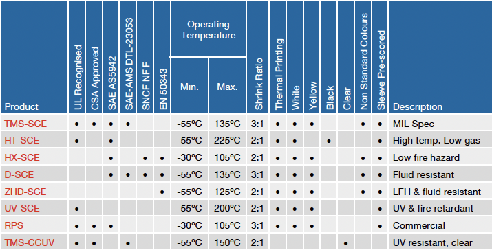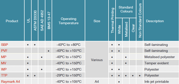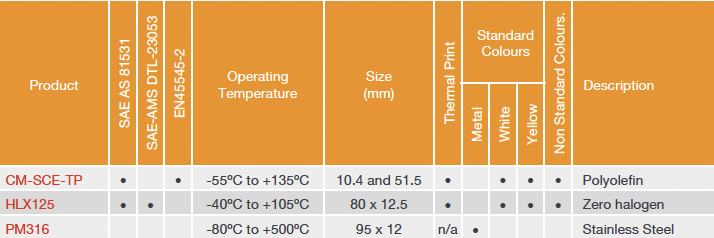 Applications range from commercial component labelling through to high performance critical systems identification. Typical product performance characteristics include extreme temperature operation, zero halogen, low smoke, low toxicity, chemical and abrasion resistance, electrical insulation, strain relief and UV resistance.