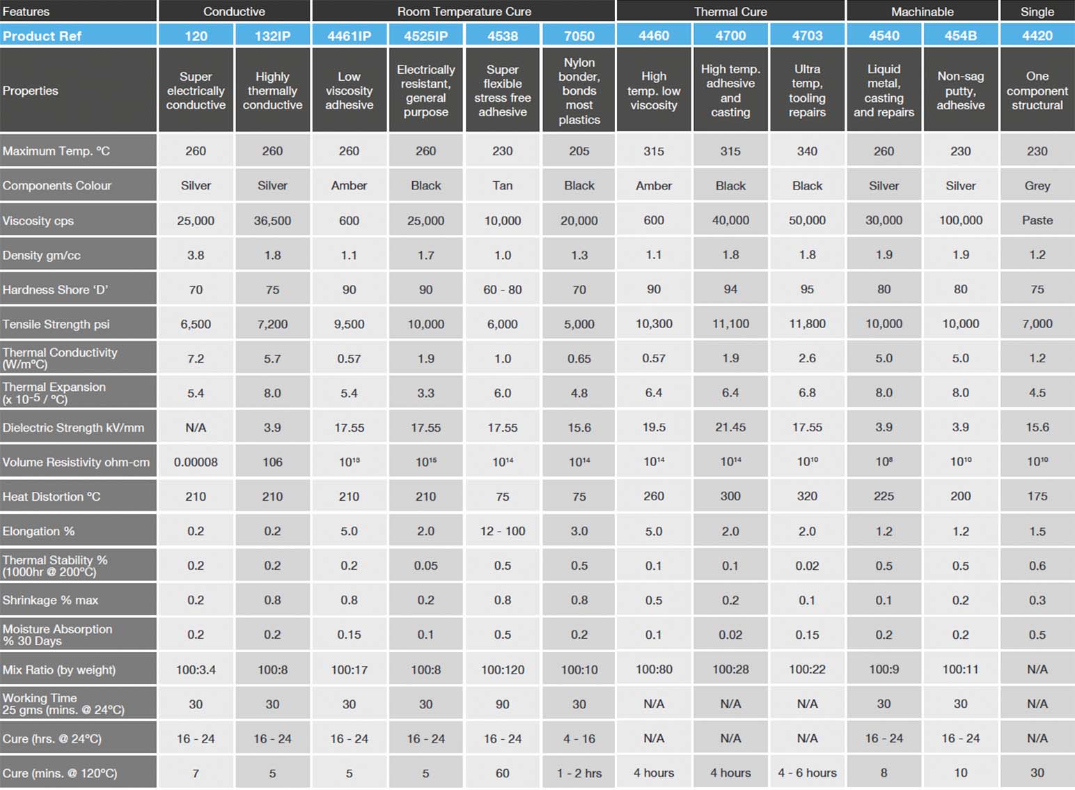 Adhesive Product Characteristics Table – Epoxy/Thermosets